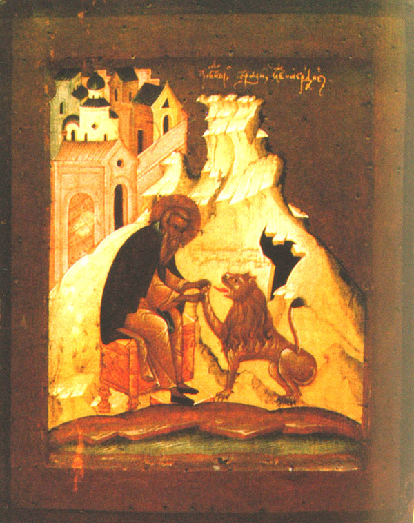Грозный лев прислуживает святому Герасиму, (арабская икона)